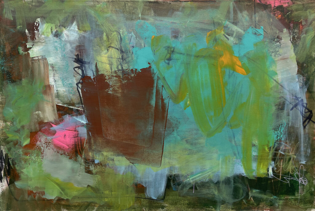 “These paintings explore constrained joy – the space in between expression and resistance when good things begin to emerge. The marks carry urgency and the color pushes outward. But something interrupts their arc – like a lurking friction that redirects and pushes into our path. What remains is a kind of suspension – a dance of competing movements – that never fully resolves. My hope is the absence of resolution invites connection and exploration.”