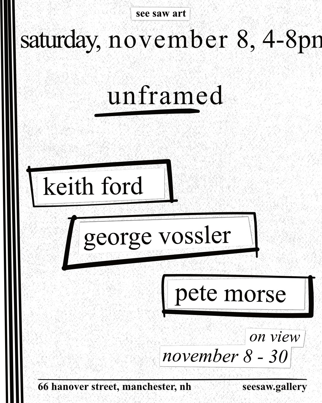 ‘Unframed’ features artworks by Keith Ford, George Vossler, and Pete Morse. Opening Reception: November 8 from 4:00-8:00 pm On view: November 8-30, 2025 Please email amy@seesaw.gallery for questions or inquiries. Installation Views