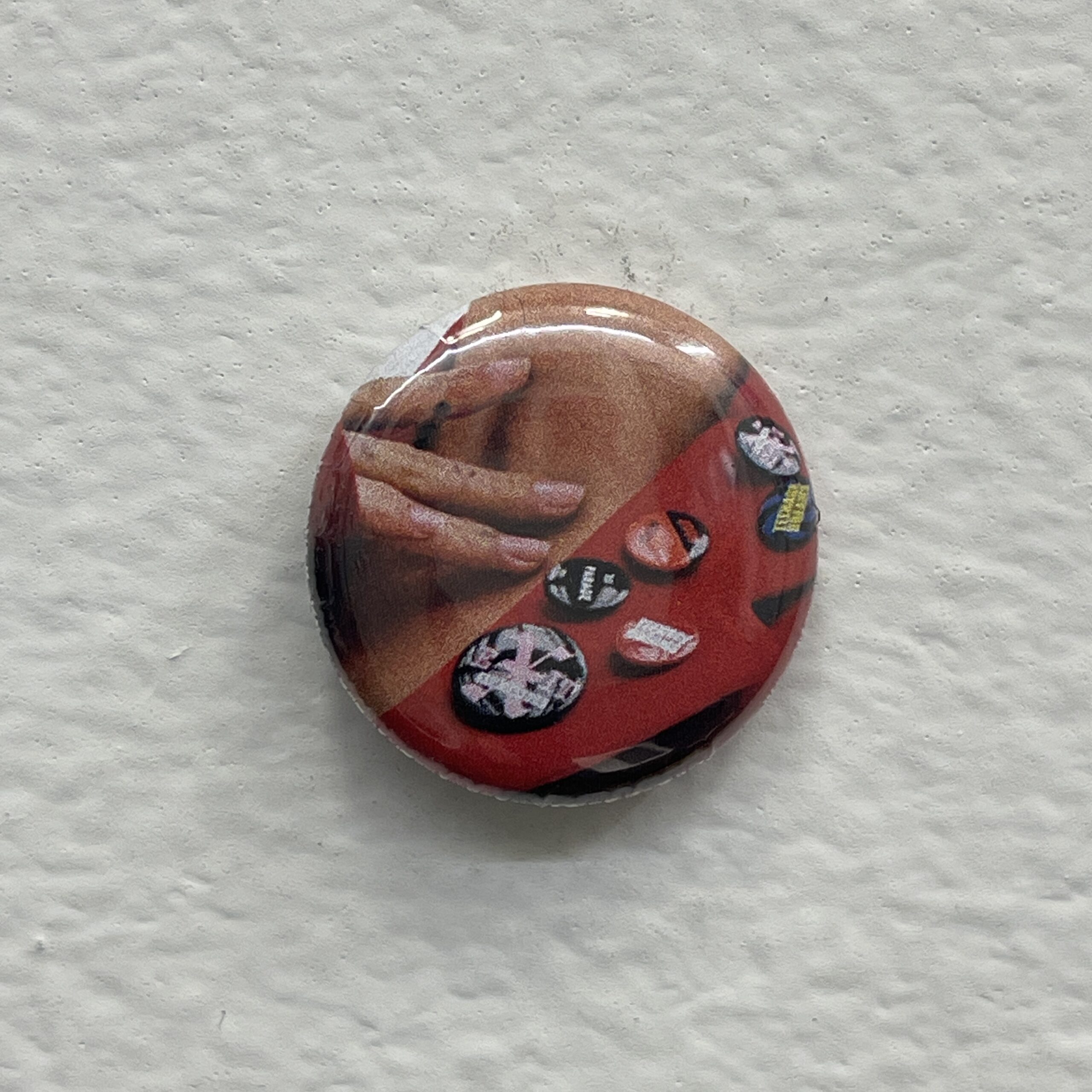Found paper, one of a kind, manual button maker