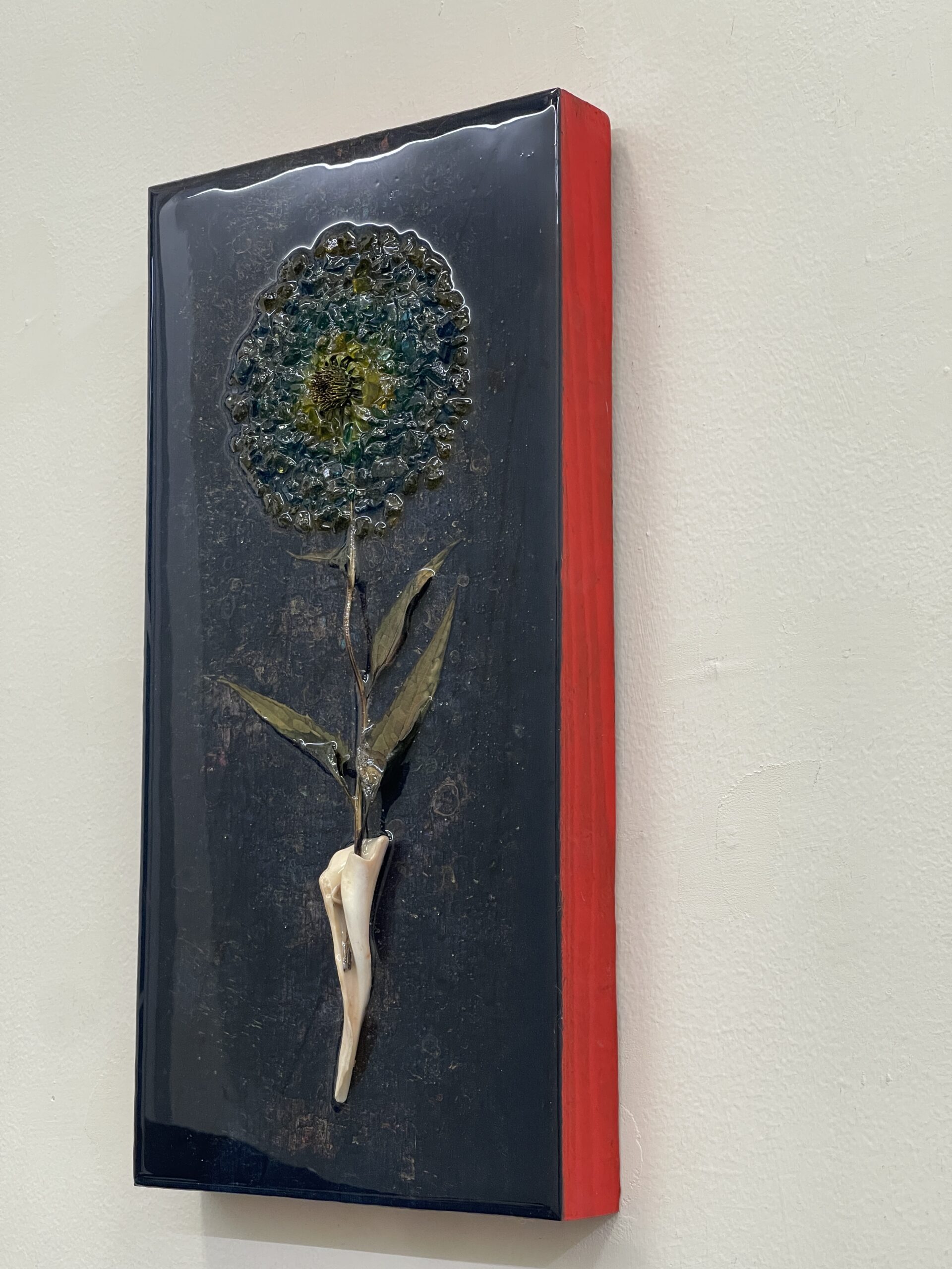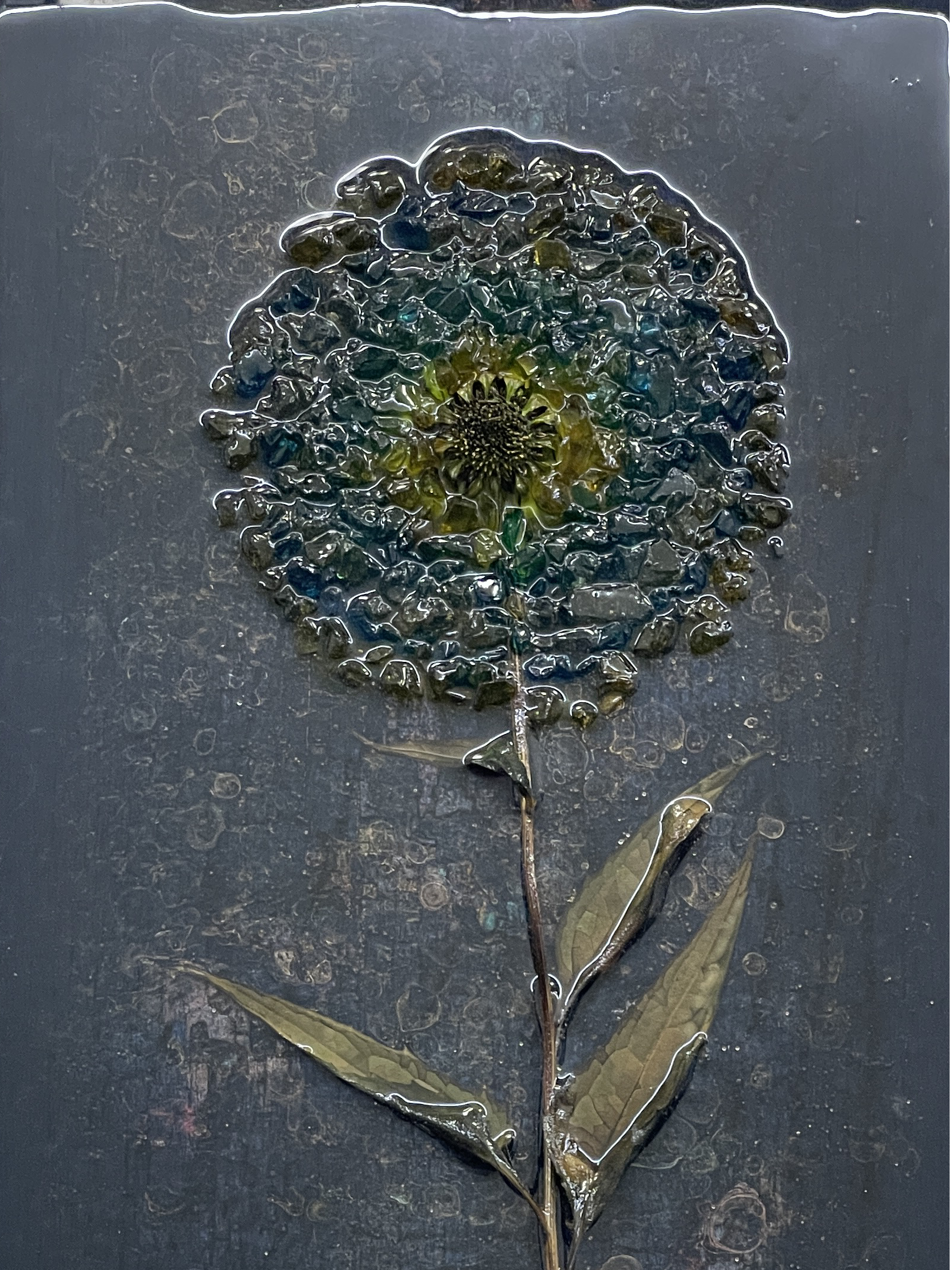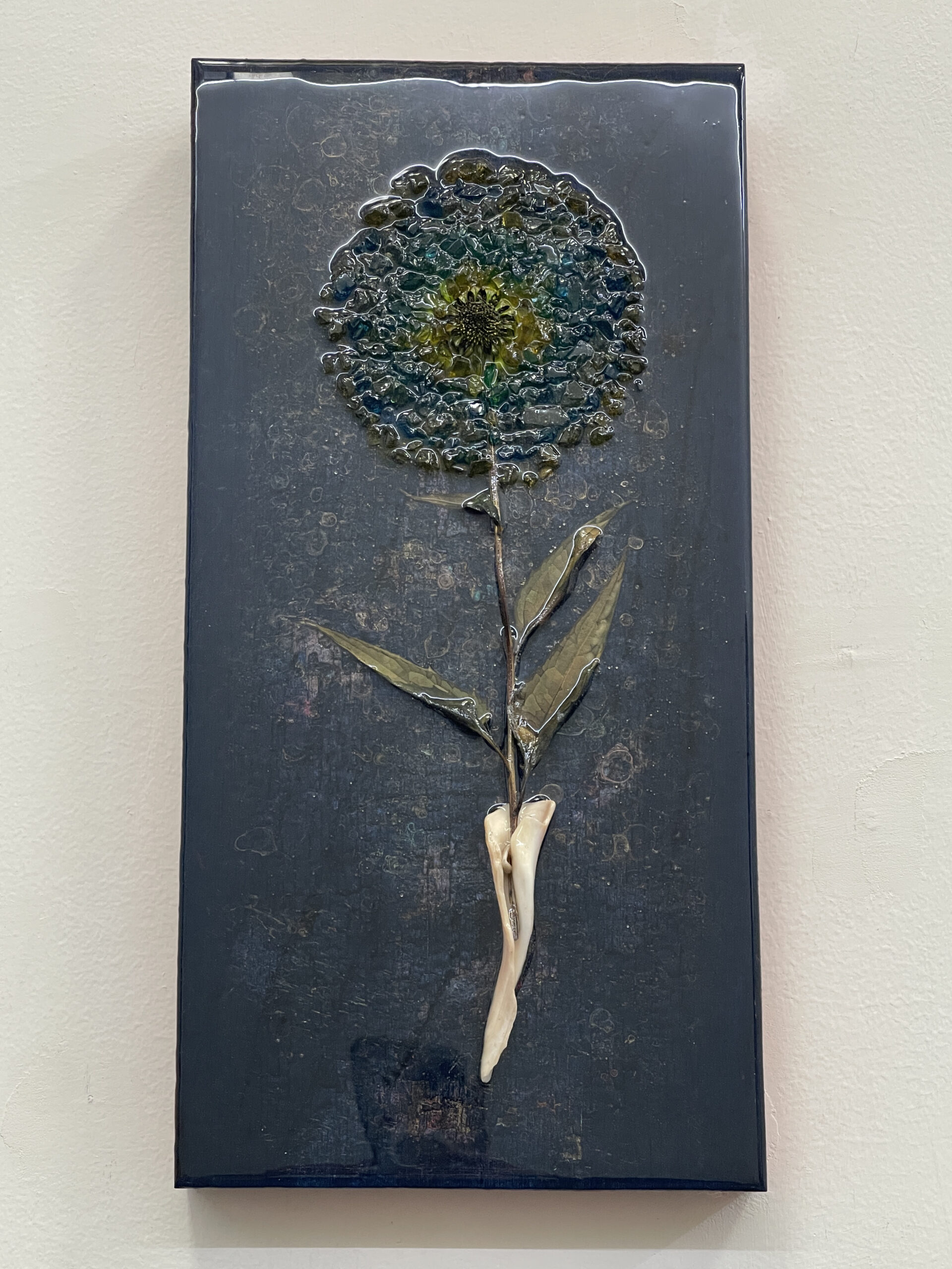 Acrylic, resin, shell, flower, colored glass